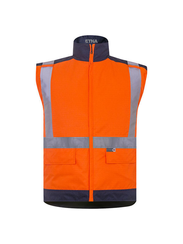 Gilet à col officier. Fermeture à glissière, double passepoils. 2 pattes de fixation poitrine pour micro déporté. 2 poches avec rabat à boutons-pression. Poche intérieure fermée par bouton-pression. Dos protège-reins. Ceinture et 2 bretelles rétroréfléchissantes microbilles RETHIOTEX® non feu de 5 cm cousues. Tissu Wovetex Stop Flamme sergé ignifugé et antistatique. Doublure fixe matelassée ignifugée. | Mercerie tout plastique. Fit&Zip : fixation dans la parka ETNA.