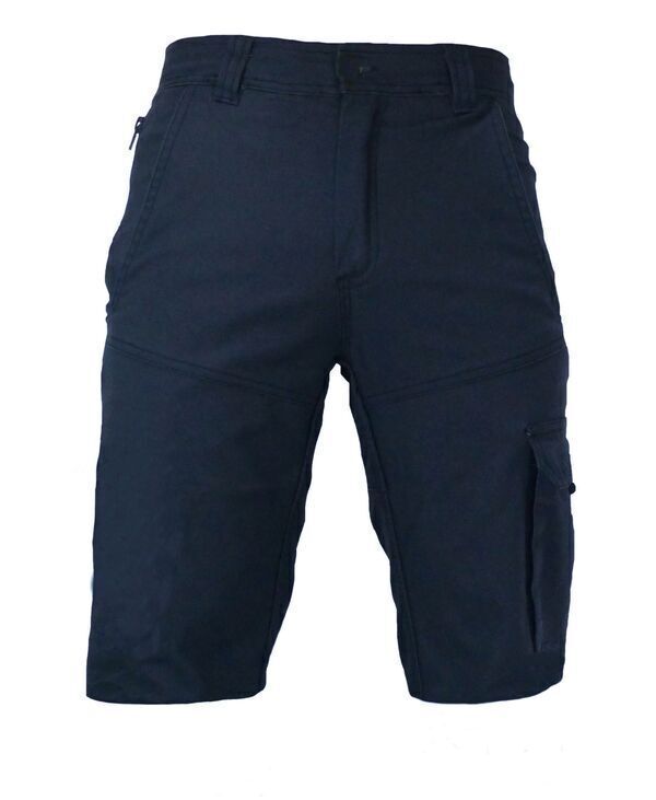 Bermuda stretch. Ceinture fermée par bouton et zip. Poches italiennes avec poche zippée côté droit au porter. Poche cuisse avec soufflet fermée par rabat avec auto-agrippant. Poche mètre. 2 poches arrière plaquées dont une fermée par rabat avec auto-agrippant. Renfort d'entrejambe. Triple surpiqûres à l'entrejambe. Rehausse dos. | Mercerie tout plastique. E.J. : 27 cm.