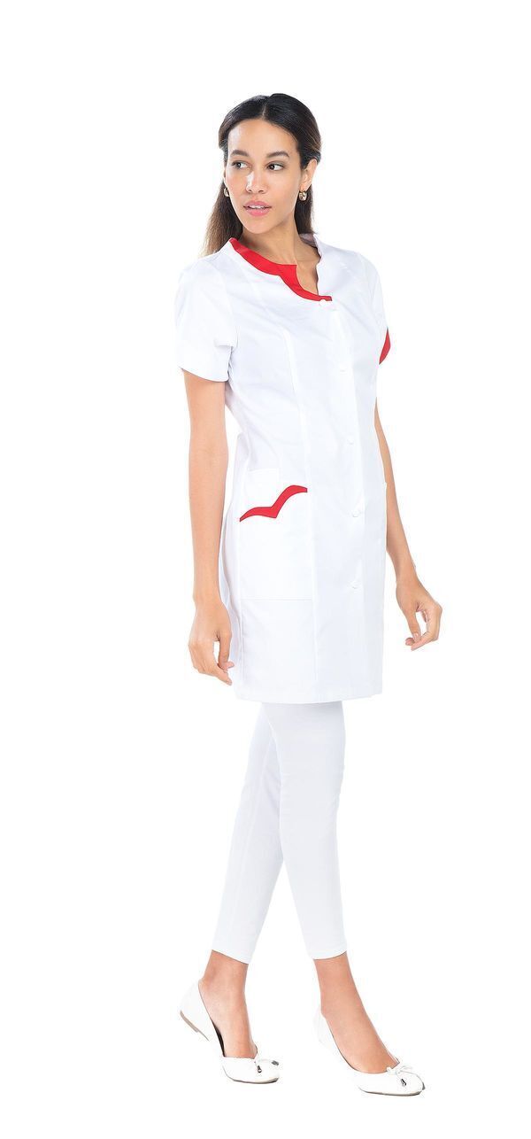 Tunique femme ajustée. Fermeture milieu devant par pressions. 2 poches basses. 2 poches BIP. Manches courtes. 2 fentes dos. Coupe ajustée. Longueur : 85 cm.