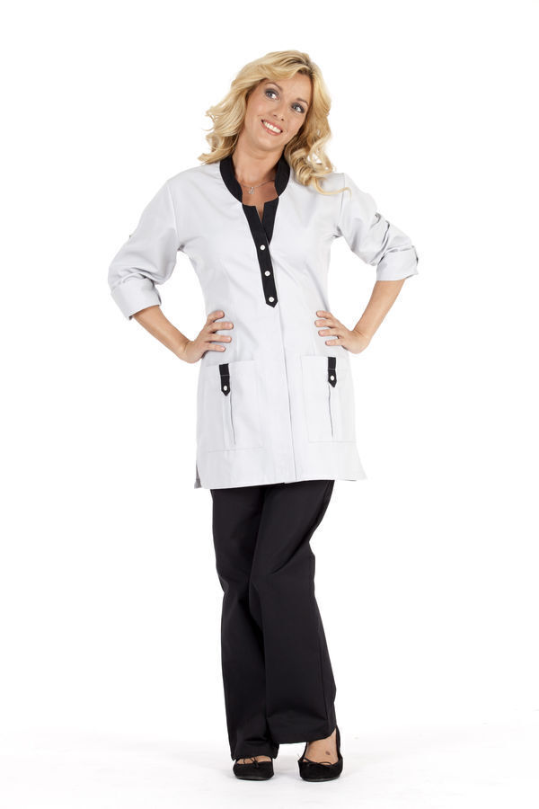 Tunique femme. Col officier fantaisie avec patte contrastée. Fermeture centrale par 5 pressions, dont 3 imitations boutons sur patte. Fentes côtés. 2 poches basses plaquées. Manches transformables avec pattes contrastées. Longueur : 80 cm.