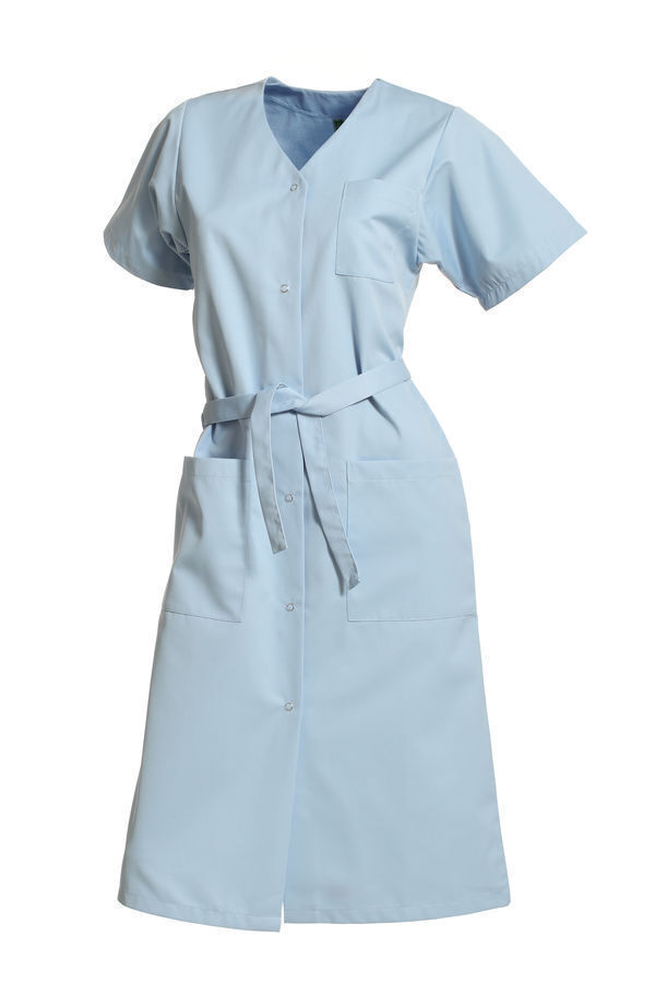 Blouse femme encolure V. Fermeture milieu devant par 6grippers. Ceinture amovible. Poche poitrine et 2 poches basses plaquées. Manches courtes avec pattes pressionnées. Longueur : 110 cm.